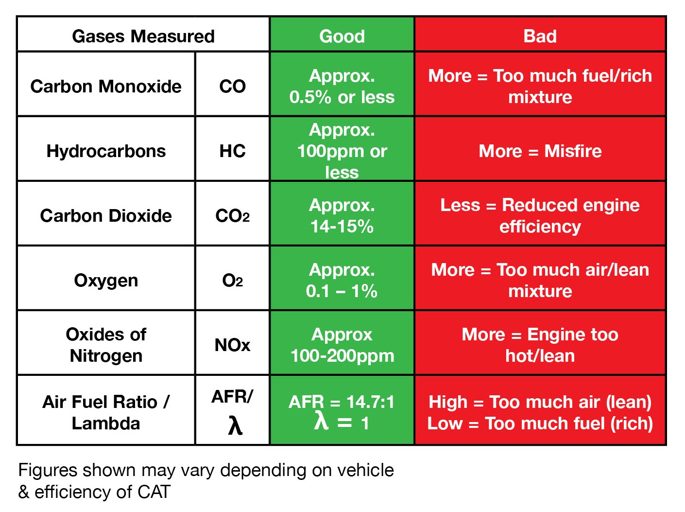 • If CO is over 0.5%, engine is fuel rich, wasting money & pollution
